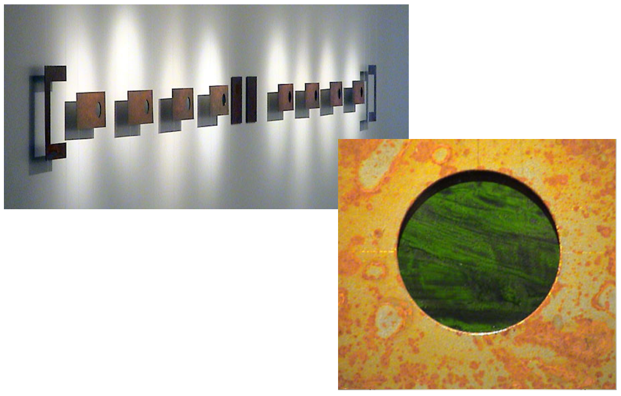 There is an environmental and physical continuity between each metal surface and the pattern of rusting it has received. Each of the small circular holograms contains images of liquid, the shadows of which exist just above the surface of the glass that holds the holographic disc.