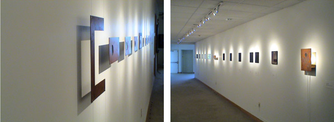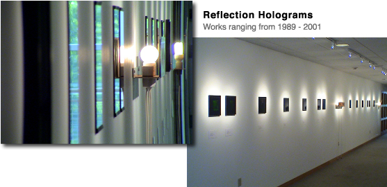 An exhibition of thirteen 10 × 8 inch reflection holograms, produced over the past fifteen years, and an installation, Sight Lines Wall, ran along several metres of the exhibition space in the Butler’s Beecher Wing, part of their Center for Technology in the Arts.