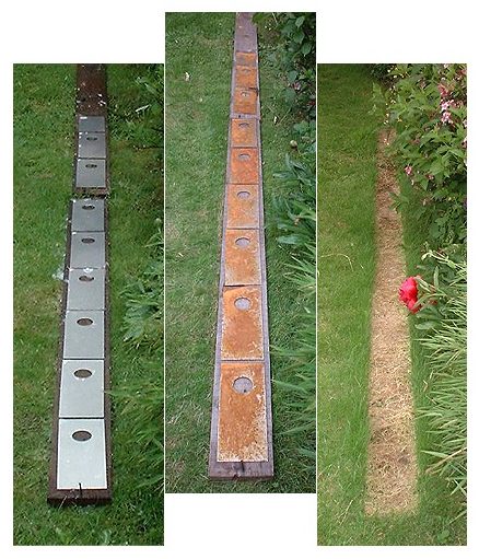 While the metal plates have ‘moved on’ to become an installation in a London gallery, they have left a shadow of their presence on the lawn, by depriving the grass of sunlight for several weeks.