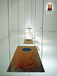 Site-specific installation, produced for the 2001 solo exhibition Deep Shadows? at Gallery 286, London, incorporates metal and holographic surfaces, electric light, and shadows cast onto the gallery floor.
