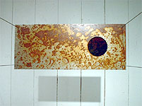 Once the rusting was complete, the plates were removed from their outdoor location (a domestic lawn) for the fitting of the holograms and drilling of the holes for the hanging cables.